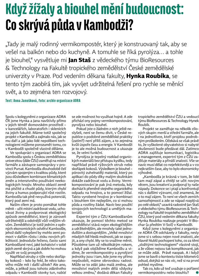 24.09.2025 - Print - Tým BioResources & Technology z Fakulty tropického zemědělství ČZU, vedený děkanem Hynkem Roubíkem, spolupracuje s organizací ADRA ČR na zlepšování zemědělských podmínek v kambodžské provincii Pursat. Projekt se zaměřuje na udržitelnou práci s půdou, která v zemi dlouhodobě trpí následky klimatických změn a používání neekologických hnojiv.Titul přináší rozhovor s Janem Stašem z vědeckého týmu BioResources & Technology na Fakultě tropického zemědělství ČZU a děkanem FTZ Hynkem Roubíkem o vývoji udržitelných řešení pro zemědělství v zemích globálního jihu. |