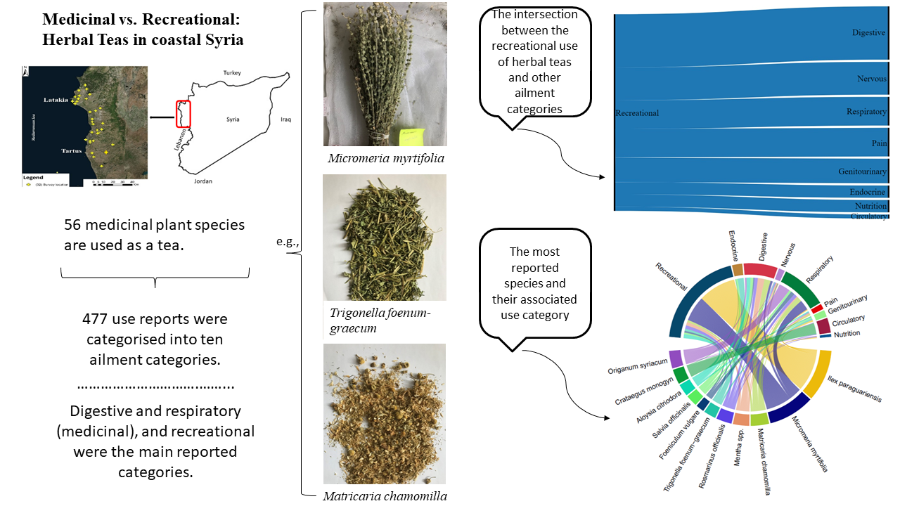 Our recently published study in the journal Plant Biosystems (IF: 1.3, Q3 in Plant Sciences) documents, applying an ethnobotanical approach, the diversity of medicinal plant species used as tea in the coastal region of Syria. The study examines the intersection between medicinal and recreational uses of herbal teas providing novel insights into the ethnobotanical knowledge of medicinal plants in an understudied area.
