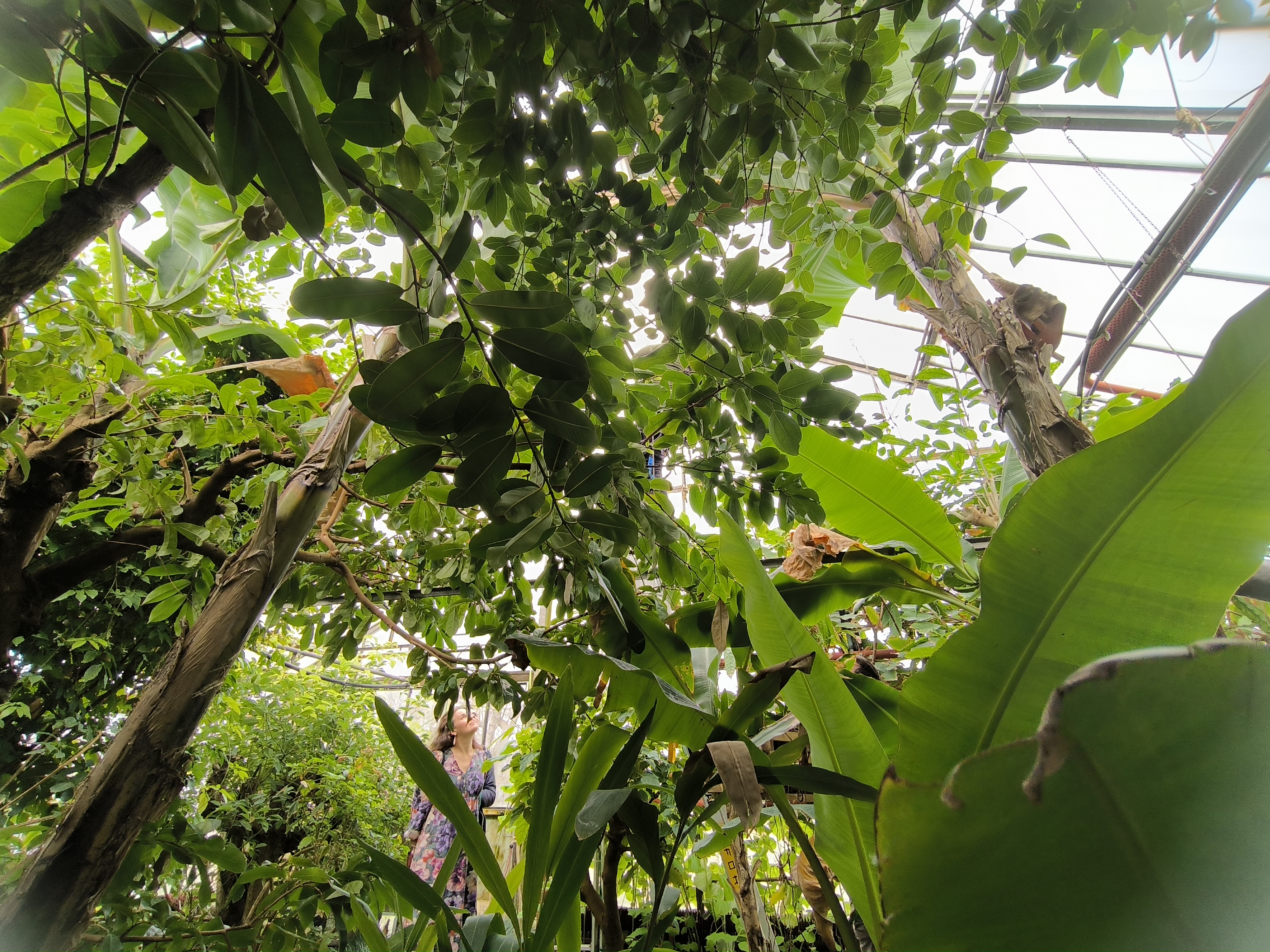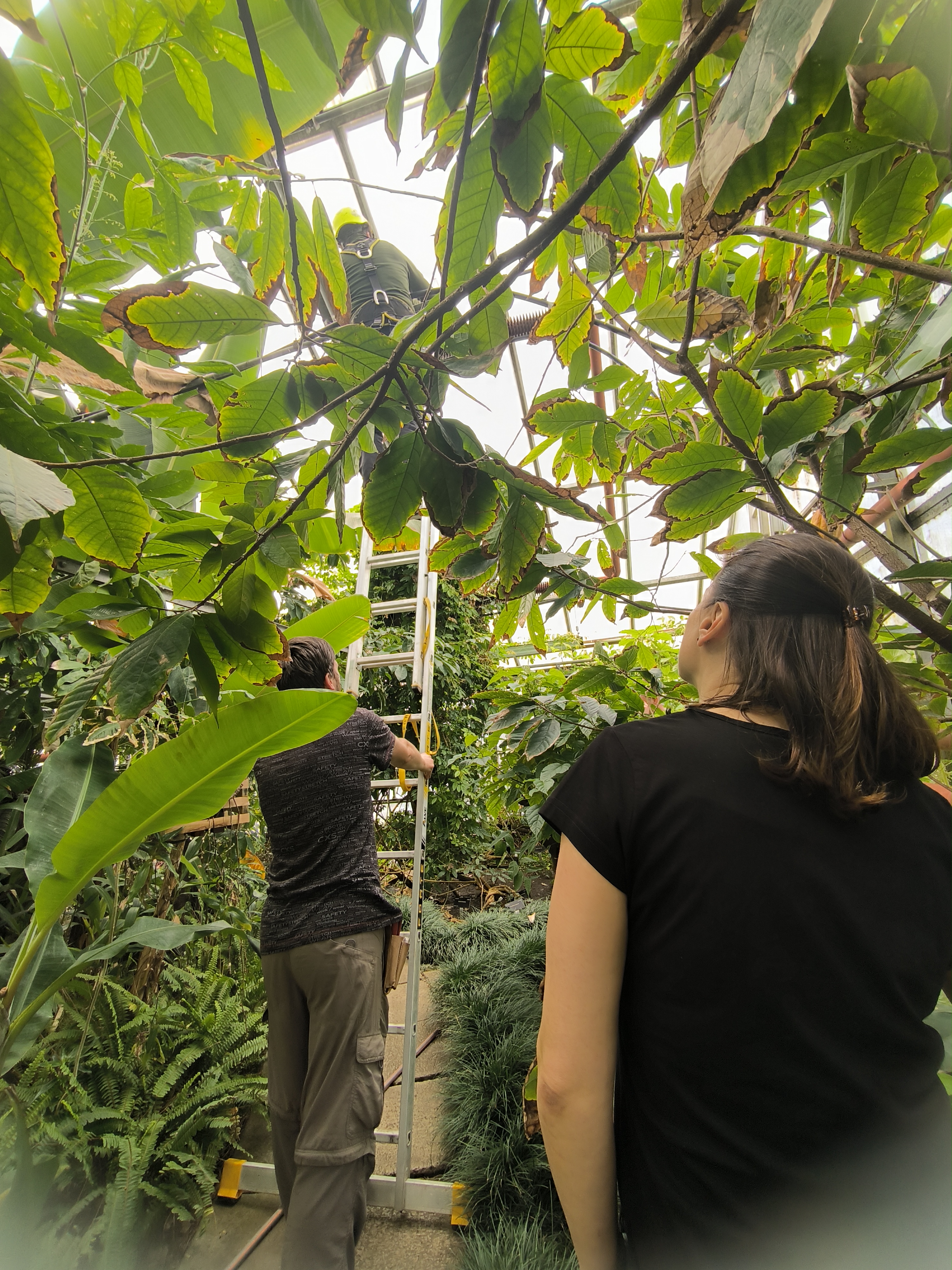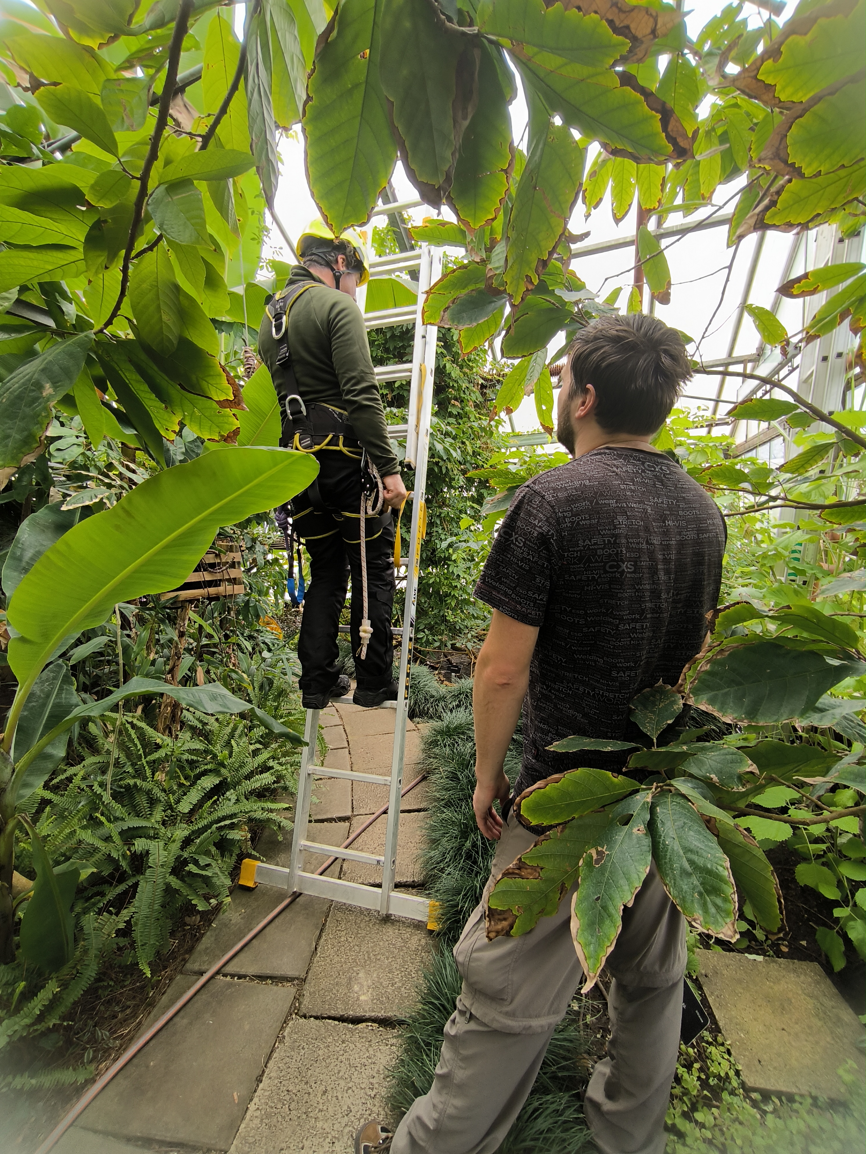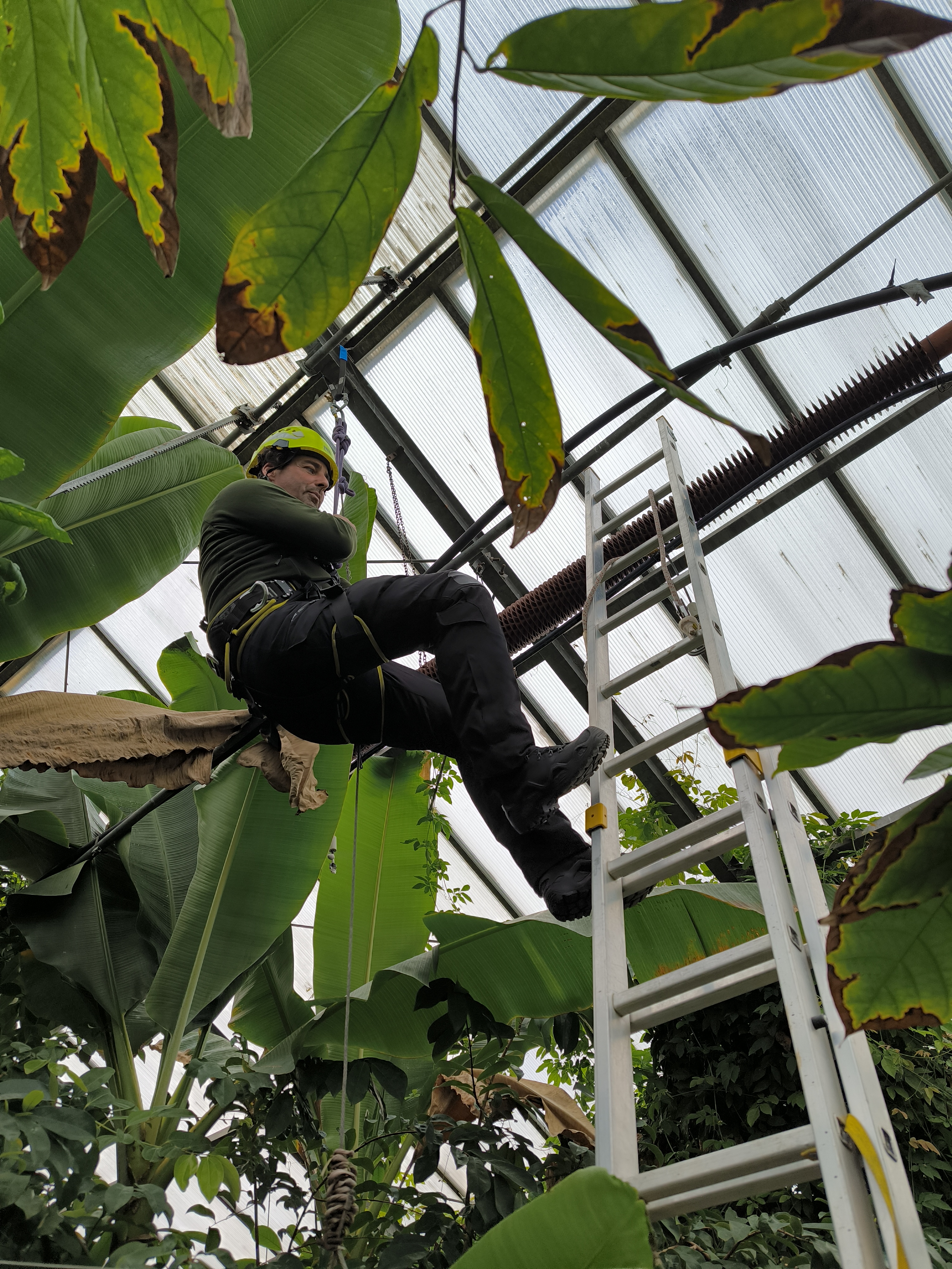Možná si říkáte, proč v botanické zahradě potřebujeme být proškoleni na práci ve výškách? Kdo zná naše skleníky, tak ví, že tropické dřeviny jsou hodně vysoké a manipulační prostor v nich je omezený. Pravidelně se musí dělat prořezávka a není to jednoduché – žebřík se v hustém porostu těžko o něco zapírá a k řezání či stříhání větví vysoko nad zemí potřebuje zahradník obě ruce. Právě proto je pro nás bezpečné jištění a správná technika pohybu ve výškách nezbytností.