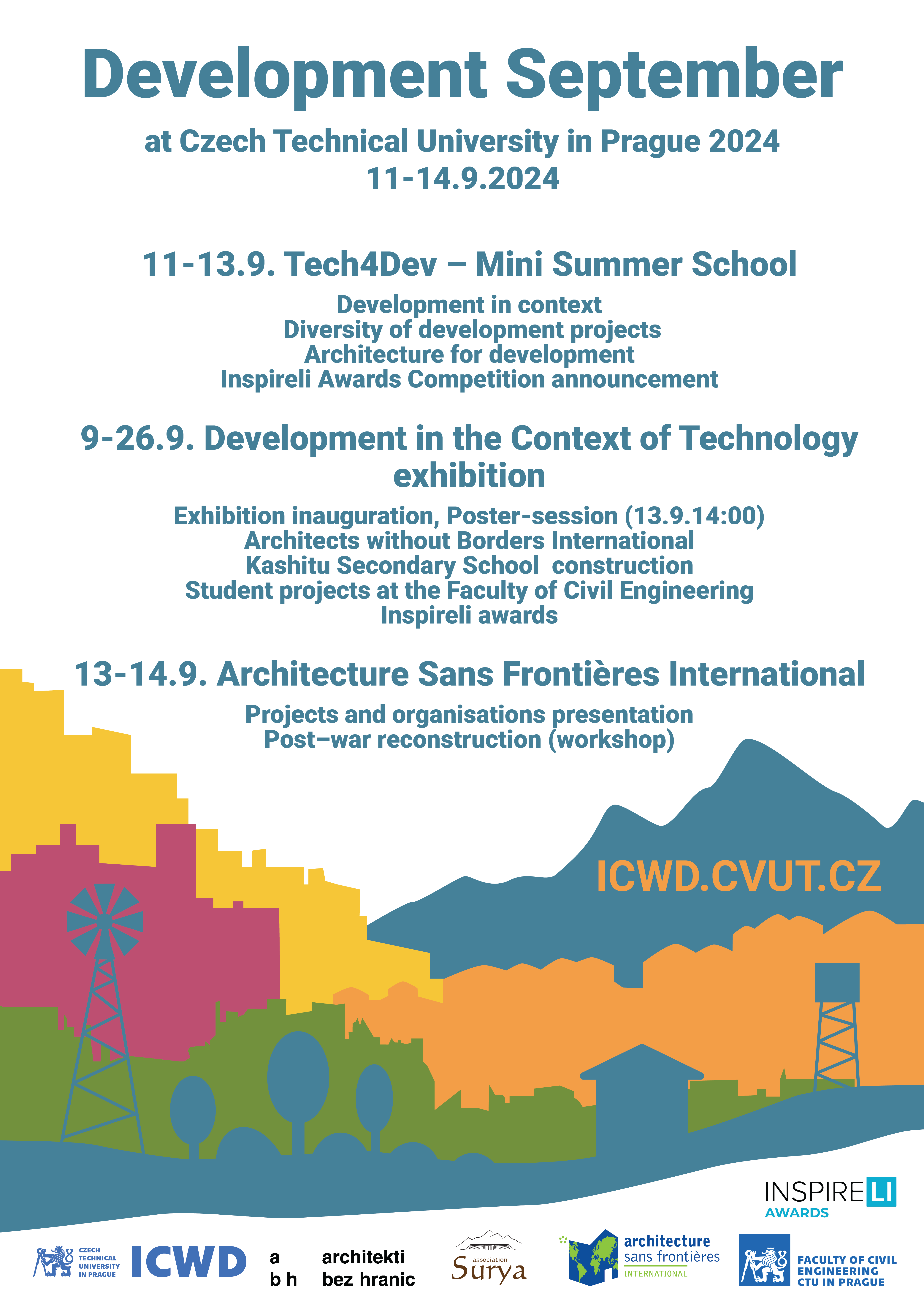 Vážení kolegové, rád bych vás pozval na letošní 5. Rozvojové září, které se bude skládat z několika akcí. První akcí bude třídenní letní škola Tech4Dev Mini Summer School, kterou společně pořádá ICWD ČVUT a Surya z. s. bude se konat od 11. 9. do 13. 9. 2024 na Stavební fakultě ČVUT v Praze. Celý program bude v anglickém jazyce. Bude zaměřena na různé rozvojové a humanitární projekty se zvláštním zaměřením na roli technických oborů. První den se budeme věnovat úvodu do problematiky globálního rozvoje a roli technických oborů v něm. Druhý den budou účastníkům přímo realizátory představeny různé rozvojové projekty s technickými aspekty. Třetí den bude zaměřen na architekturu.