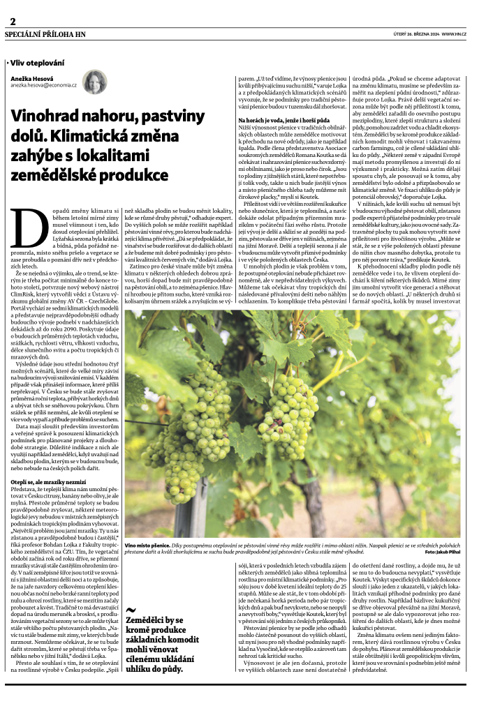 Vegetační období díky mírným zimám u nás začíná dříve. Ranní mrazy ale zůstávají a mají devastující dopad na plodiny, což se projevilo také v uplynulých dnech. Tomuto tématu se věnovala speciální příloha Hospodářských novin – Zemědělství a lesnictví, jejíž součástí je komentář profesora Bohdana Lojky z FTZ, který osvětluje, jak se měnící se podnebí může promítnout i do naší zemědělské praxe.