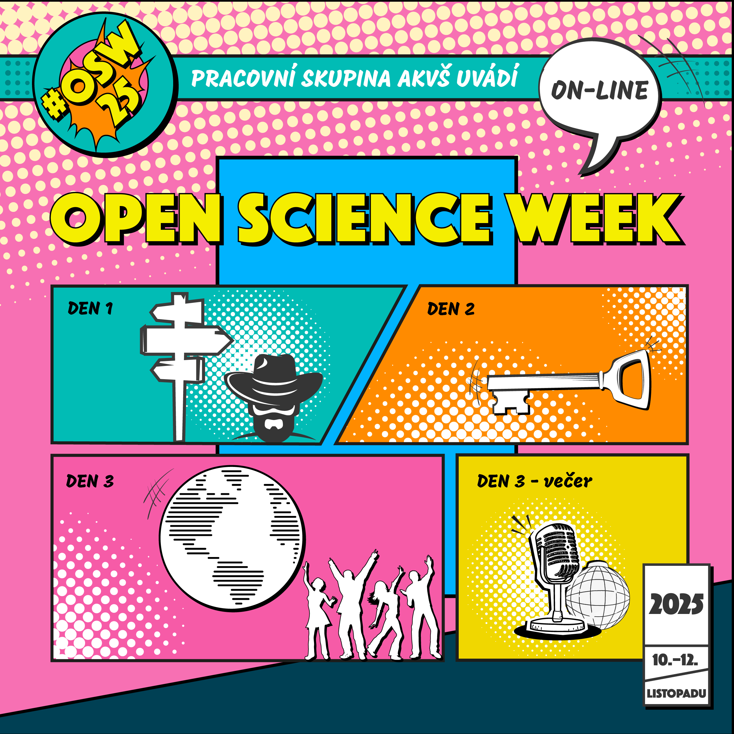 Od 10. do 12. listopadu 2025 opět proběhne Open Science Week 2025, znovu převážně online přes Zoom, s fyzickým setkáním v Praze ve středu večer.