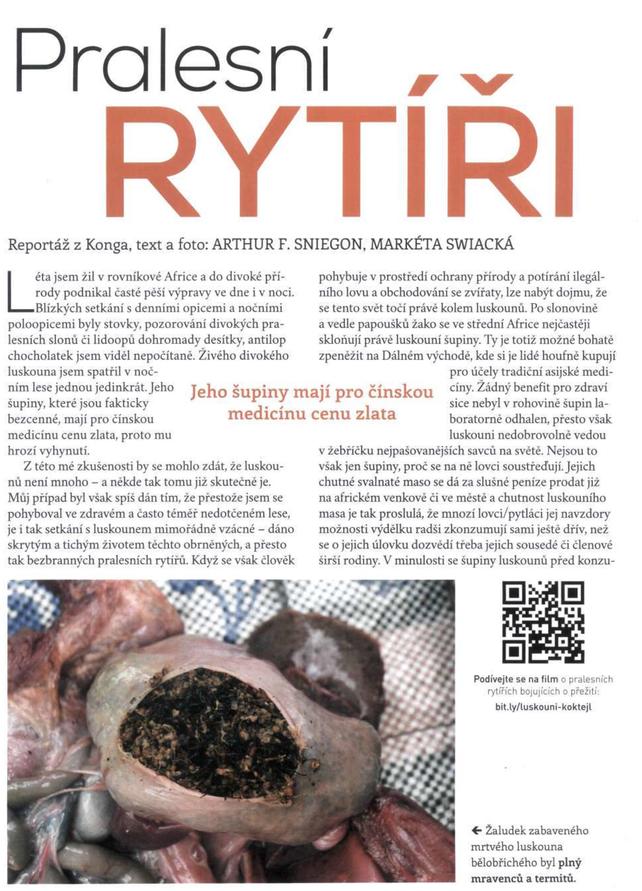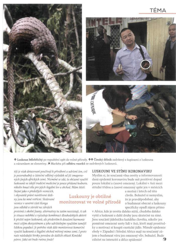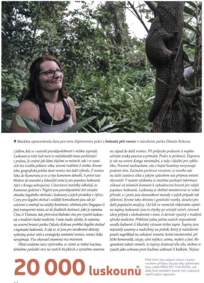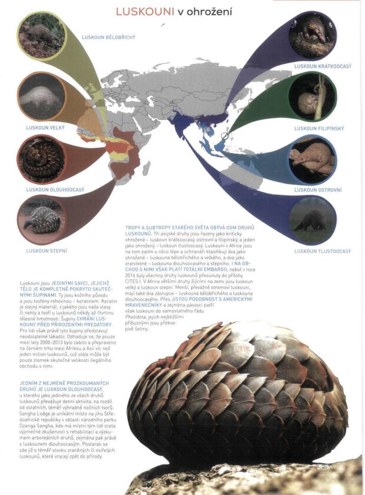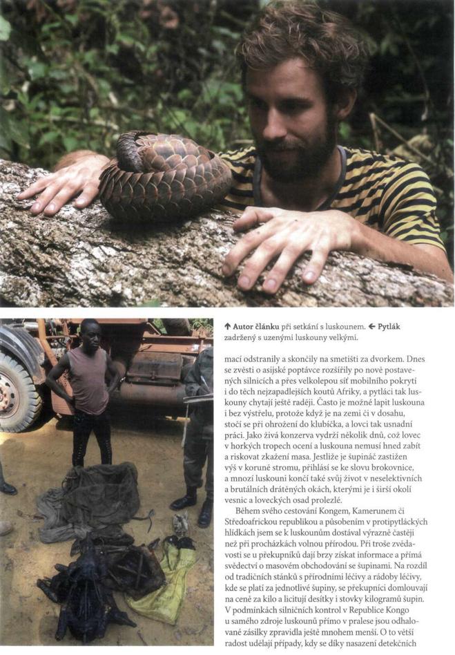Léta jsem žil v rovníkové Africe a do divoké přírody podnikal časté pěší výpravy ve dne i v noci. Blízkých setkání s denními opicemi a nočními poloopicemi byly stovky, pozorování divokých pralesních slonů či lidoopů dohromady desítky, antilop chocholatek jsem viděl nepočítaně. Živého divokého luskouna jsem spatřil v nočním lese jednou jedinkrát. Jeho šupiny, které jsou fakticky bezcenné, mají pro čínskou medicínu cenu zlata, proto mu hrozí vyhynutí.