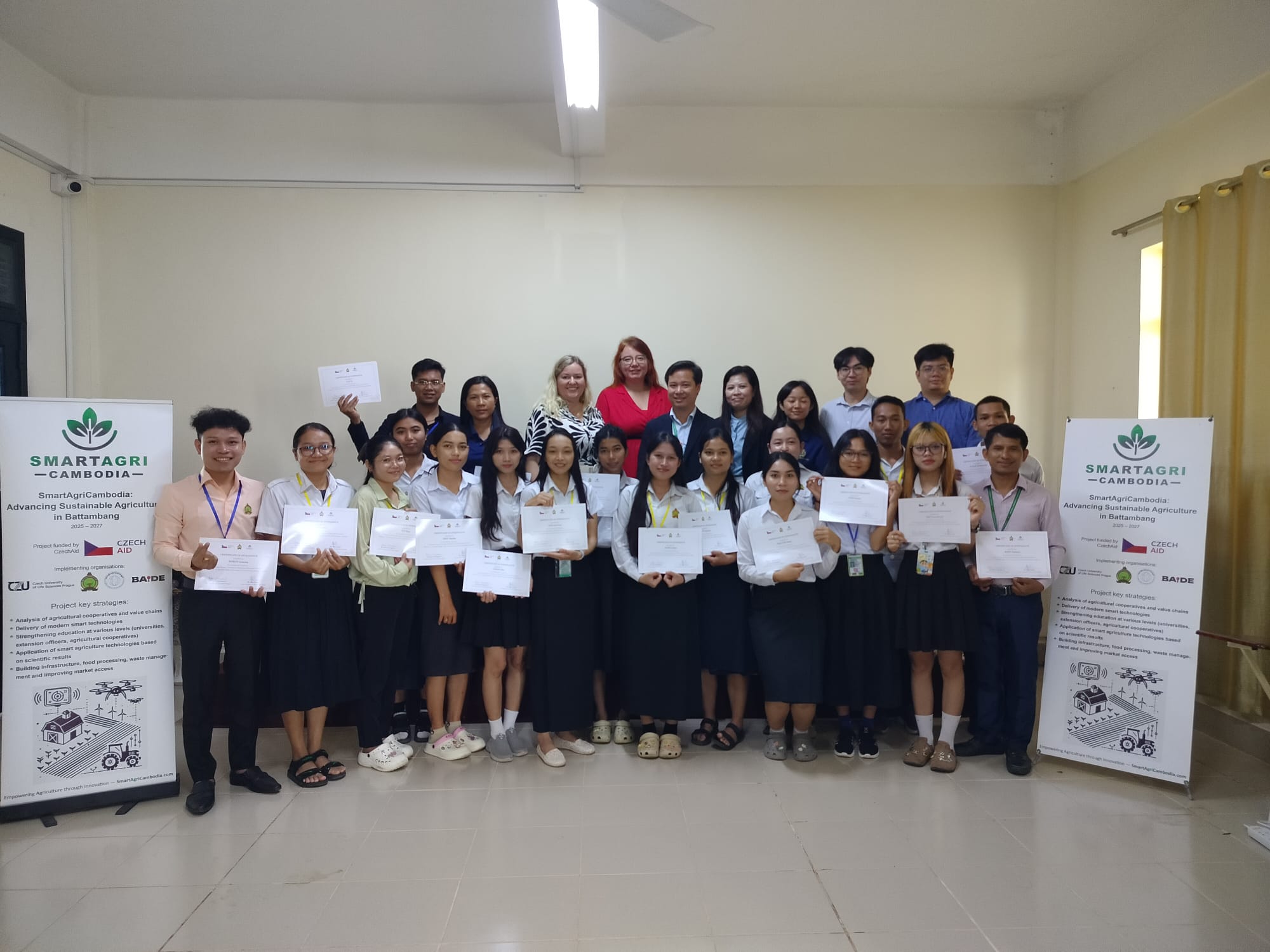 Toto školení bylo organizováno v rámci projektu SmartAgriCambodia: Advancing Sustainable Agriculture in Battambang. Lekce vedly Dr. Olga Leuner a Dr. Petra Chaloupková, Fakulta tropického zemědělství (FTZ), které sdílely své znalosti o posklizňové manipulaci, bezpečnosti potravin, technologiích balení a marketingových strategiích přizpůsobených tropickému prostředí.