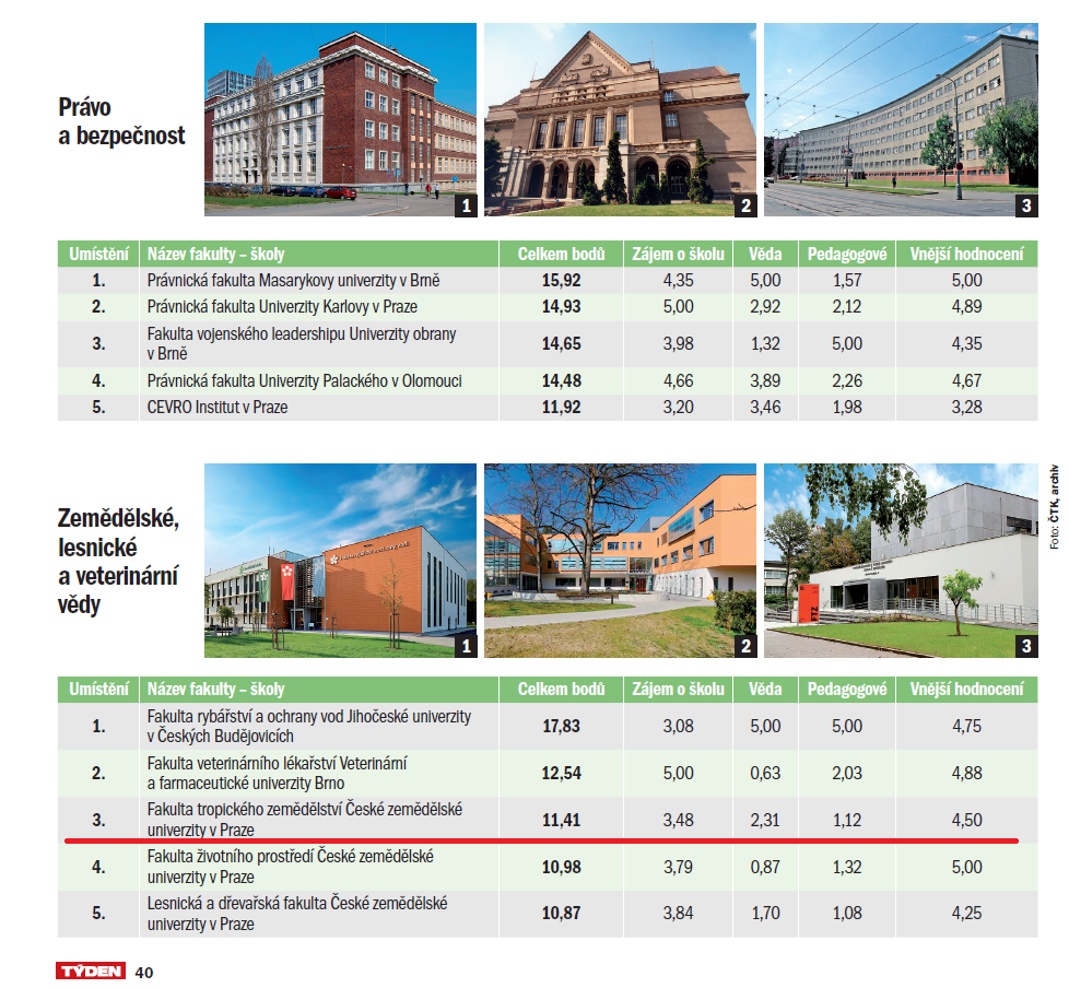 Toto srovnání provádí již řadu let časopis Týden. Srovnání vysokých škol bylo provedeno na základě následujících kritérií: zájem o fakultu, pedagogové, věda a vnější hodnocení. Fakulta tropického zemědělství obsadila třetí místo v kategorii "Zemědělské, lesnické a veterinární vědy". Dalším úspěchem ČZU je umístění Fakulta životního prostředí - ČZU v Praze a Fakulta lesnická a dřevařská - ČZU v Praze na čtvrtém a pátém místě v téže kategorii.