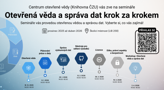 Centrum otevřené vědy (Knihovna ČZU) vás zve na sérii seminářů, které vám pomohou lépe se orientovat v principech otevřené vědy, splnit požadavky grantů a usnadnit každodenní práci při správě výzkumných dat.