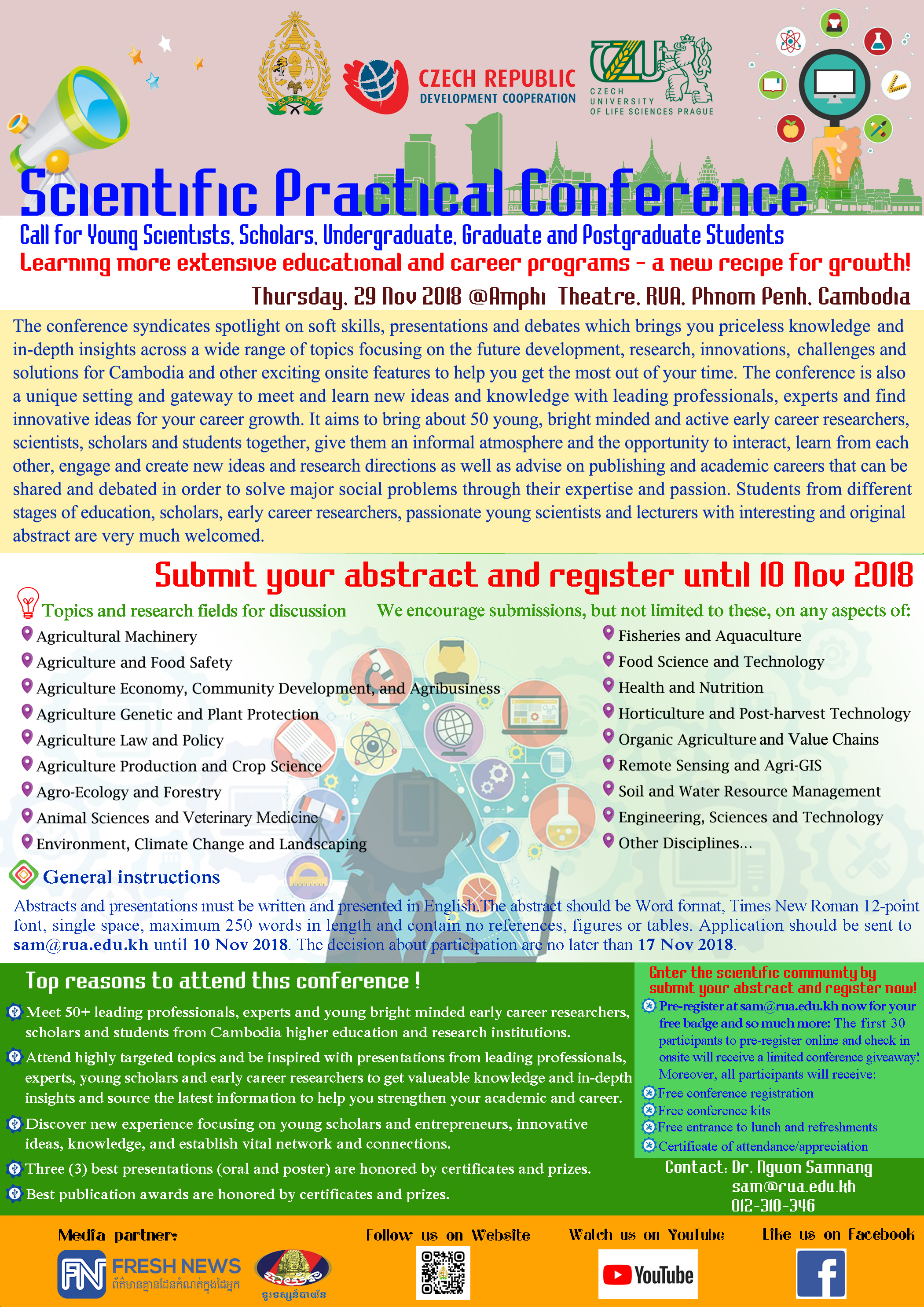 The Czech University of Life Sciences Prague together with the Royal University of Agriculture are organising the Scientific Practical Conference hosted at the Royal University of Agriculture, Phnom Penh, Cambodia on 29th November 2018. The call for abstracts is open till 10th November and we highly encourage young scientists, scholars, undergraduate, graduate and postgraduate students to apply and participate this conference. The topics are related to agriculture and life sciences in a broad sense.